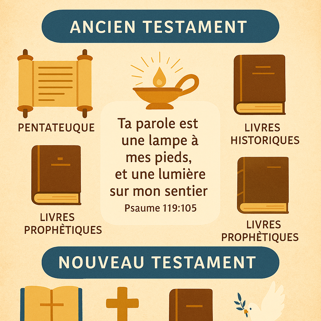 La Bible se compose de 66 livres répartis en deux grandes parties : l’Ancien Testament et le Nouveau Testament. Loin d’être dépassé, l’Ancien Testament demeure aussi vivant que le Nouveau. Toute la Bible s’organise autour de l’histoire d’un peuple, le peuple d’Israël, que Dieu s’est choisi pour révéler son dessein de salut à l’humanité. Tandis que l’Ancien testament est une préfiguration du Christ, le Nouveau testament en est la révélation.